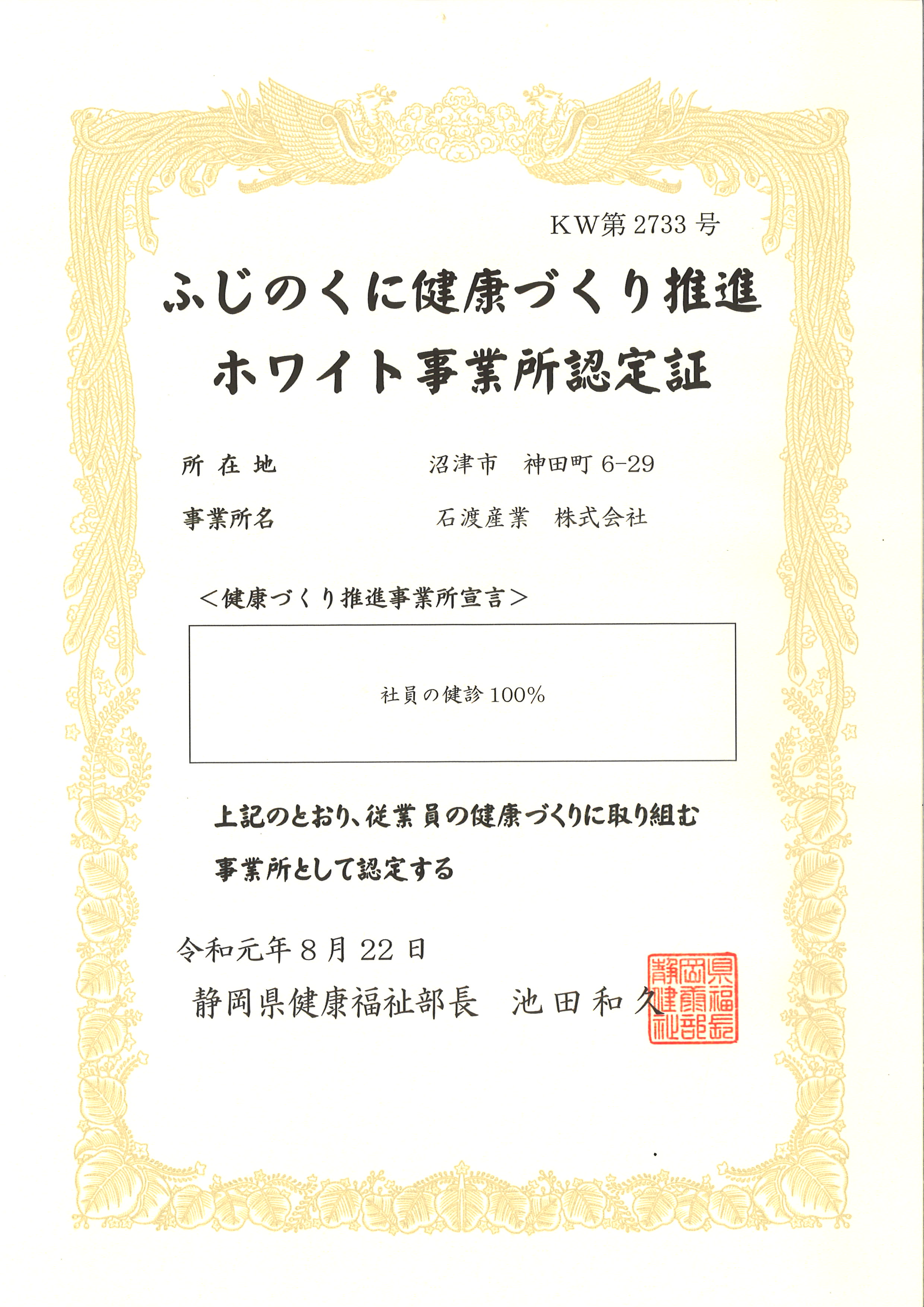 静岡県健康福祉部から、健康経営・健康宣言に取り組む企業として、 今年度から創設された「ふじのくに健康づくり推進事業所」に認定されました。 これからも、社員の健康づくりに積極的に取り組んでいきたいと思います。