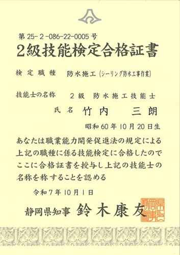 竹内三朗さんが、「2級シーリング防水工事作業技能検定試験」に見事合格しました。