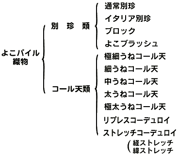 よこパイル織物は、最近になってイタリア別珍、よこブラッシュ、極太うねコール天およびリプレスコーデュロイが出現してき、その商品群は非常に幅広いものとなっています。したがって、よこパイル織物を単純に別珍あるいはコール天と呼称することができなくなってきています。
