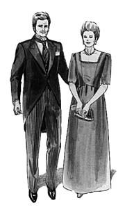 新郎が昼、正装のモーニングなら、仲人もモーニング、夜ならタキシードです。平服の指定のある時は、昼はディレクター・スーツかブラック・スーツ、夜はファンシー・スーツかブラック・スーツに、夜向きのアクセサリーをコーディネートします。