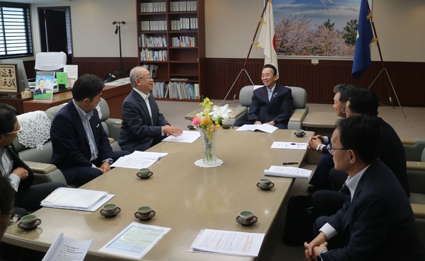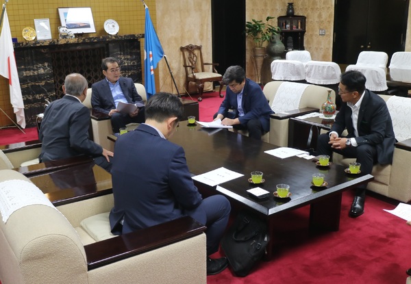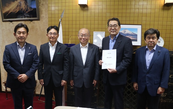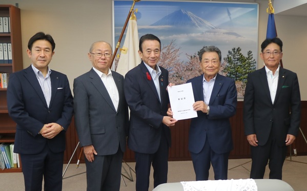 令和7年10月10日、静岡県中央会は静岡県庁を訪問し、鈴木康友 県知事、竹内良訓 県議会議長に対して、令和8年度静岡県予算の確保などを求める要望書を提出しました。